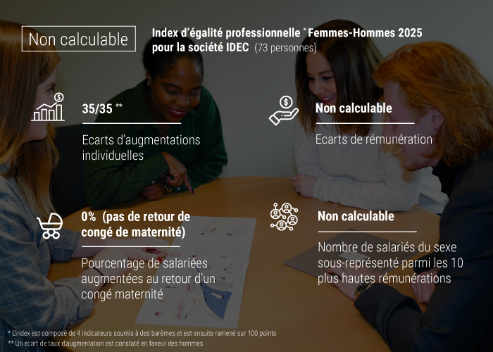 Dans un univers de l’immobilier et de la construction très masculin, nous nous efforçons de donner une chance égale à l’ensemble des femmes et des hommes qui souhaitent nous rejoindre. Quel que soit les postes proposés et leurs niveaux de responsabilité, nous prônons l’inclusion, la diversité femme / homme, la mixité sociale et l’intégration de personnes en situation de handicap. Pour l’année 2025, l’index égalité homme / femme de la société IDEC qui rassemble 73 collaborateurs, n’est pas calculable, un score qui mérite toute l’attention de nos équipes des Ressources Humaines pour en améliorer la portée.